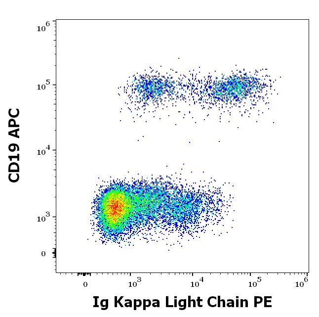 Flow cytometry multicolor surface staining of human lymphocytes stained using anti-human Ig Kappa Light Chain (TB28-2) PE antibody (10 μl reagent / 100 μl of peripheral whole blood) and anti-human CD19 (LT19) APC antibody (10 μl reagent / 100 μl of peripheral whole blood).
