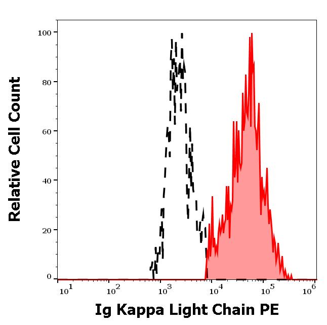 Separation of human Ig Lambda Kappa Chain positive B cells (red-filled) from Ig Kappa Light Chain negative B cells (black-dashed) in flow cytometry analysis (surface staining) of human peripheral whole blood stained using anti-human Ig Kappa Light Chain (TB28-2) PE antibody (10 μl reagent / 100 μl of peripheral whole blood).