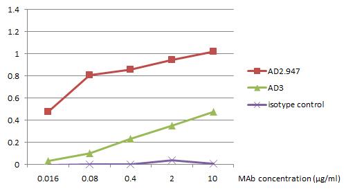 ELISA analysis of IgA in 1000x diluted human plasma using mouse monoclonal antibodies AD2.947 and AD3 (0.016 - 10 μg/ml).