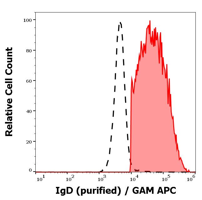 Separation of human IgD positive lymphocytes (red-filled) from neutrofil granulocytes (black-dashed) in flow cytometry analysis (surface staining) of peripheral whole blood stained using anti-human IgD (IA6-2) purified antibody (concentration in sample 0,33 μg/ml, GAM APC).