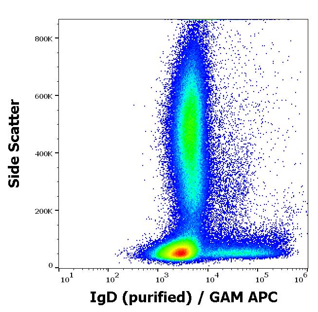 Flow cytometry surface staining pattern of human peripheral whole blood stained using anti-human IgD (IA6-2) purified antibody (concentration in sample 0,33 μg/ml, GAM APC).