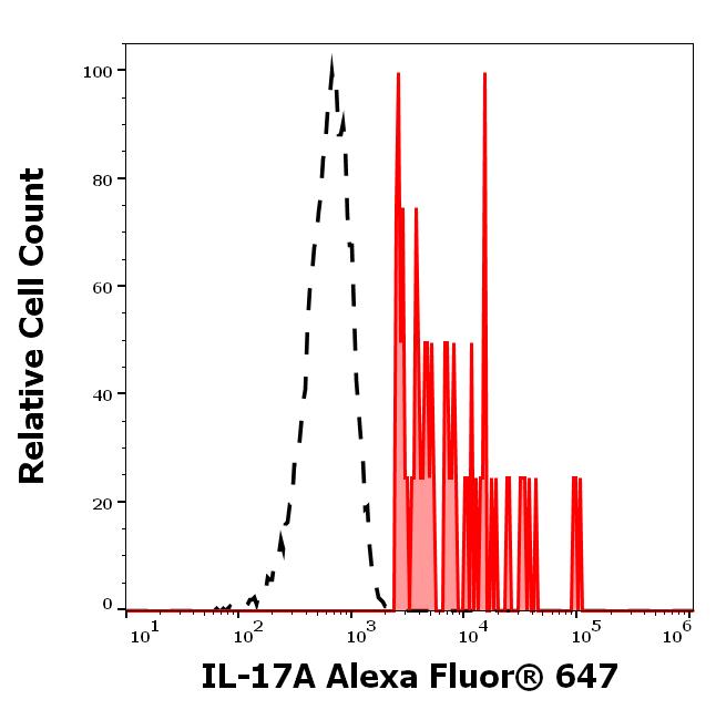 Separation of human CD3 positive IL-17A positive T cells (red-filled) from CD3 negative IL-17A negative lymphocytes (black-dashed) in flow cytometry analysis (surface staining) of human PHA stimulated and brefeldin treated peripheral blood mononuclear cells stained using anti-human IL-17A (9F9) Alexa Fluor® 647 antibody (concentration in sample 1.67 μg/ml).