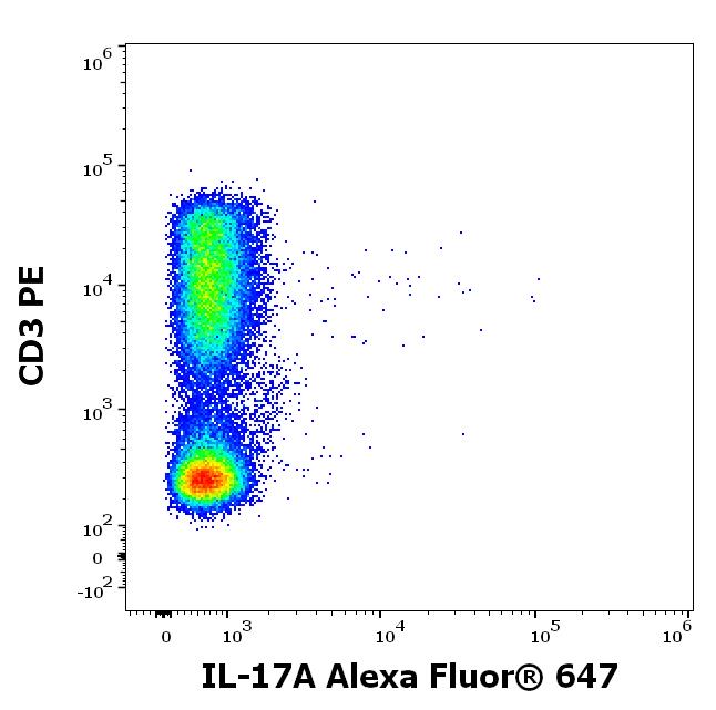 Flow cytometry multicolor surface staining pattern of human PHA stimulated and brefeldin treated lymphocytes stained using anti-human CD3 (UCHT1) PE antibody (20 μl reagent / 100 μl of peripheral whole blood) and anti-human IL-17A (9F9) Alexa Fluor® 647 antibody (concentration in sample 1.67 μg/ml).