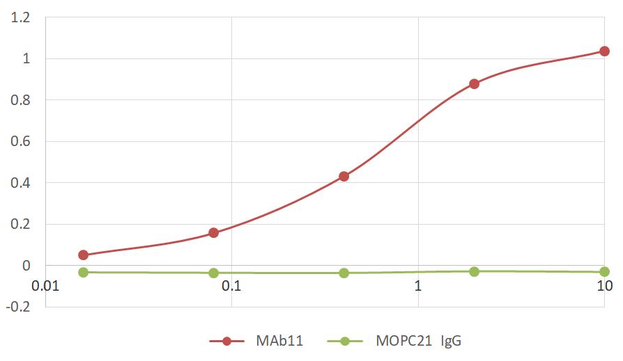 ELISA analysis of TNF alpha (1 μg/ml) using mouse monoclonal antibody MAb11 (0.01 - 10 μg/ml).