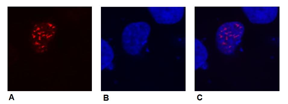 Immunocytochemistry (confocal microscopy) of COS-7 cells transfected with expression constructs encoding fusion nuclear protein with DDDDK epitope. A - fusion nuclear protein (red) stained with purified anti-DDDDK (F-tag-01) (detection by Goat anti-mouse IgG1 Alexa Fluor® 594) B - cell nuclei stained with DAPI (blue) C - merged figures - confirmation of nuclear localization of the fusion protein; cell nuclei stained with DAPI (blue)