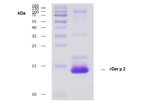 Recombinant protein rDer p 2 is expressed in S2 cells (Drosophila). DNA sequence encoding 143 AAs was fused with Strep-tag at the N-terminus. A calculated molecular mass of recombinant protein is 15,7 kDa.
