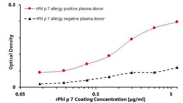 ELISA (enzyme-linked immunosorbent assay) test was designed to prove the bond between the coated target recombinant allergen rPhl p 7 and allergen-specific human plasma IgG4 antibodies of Phleum pratense positive donor. A measurable signal was subsequently generated by the addition of biotin labeled anti-human IgG4 (detection) antibody, Streptavidin-HRP and substrate solution (TMB). The intensity of the signal is proportional to the amount of coated rPhl p 7.