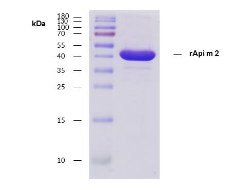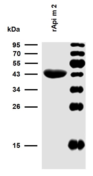 Recombinant protein rApi m 2 is expressed in S2 cell (Drosophila). DNA sequence encoding 363 AAs was fused with Strep-tag at the N-terminus. A calculated molecular mass of recombinant protein is 42,3 kDa.